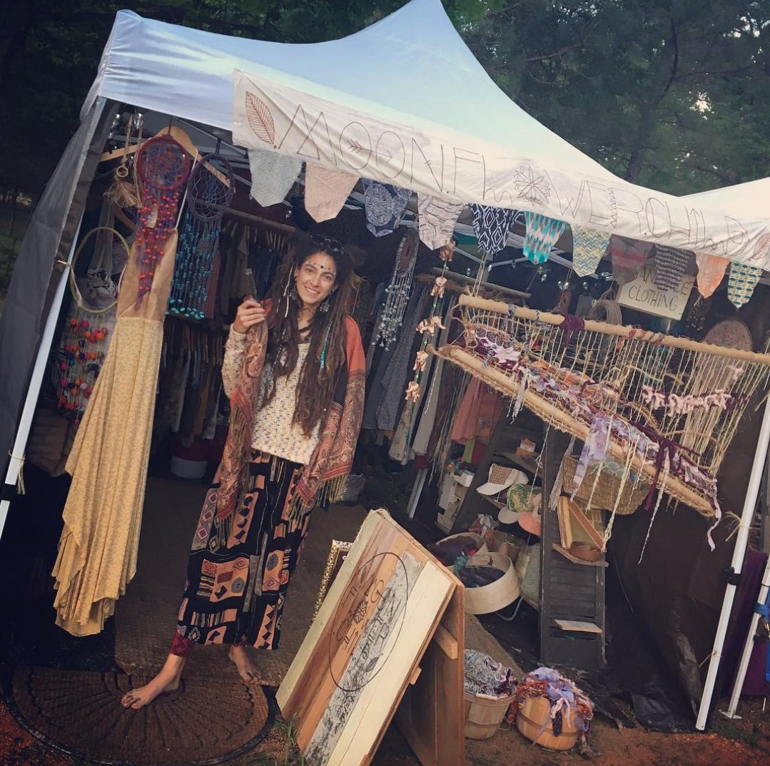 After graduating with my degree in fashion, I was filled with excitement and determination to take my designs into the world. I founded my business in 2013 and named it Moon Flower Child, which would become a space to sell my creations—clothing, jewelry, and handmade art—at festivals, markets, pop ups and stocklists. It was an exhilarating time to see my vision come together in such a tangible way.